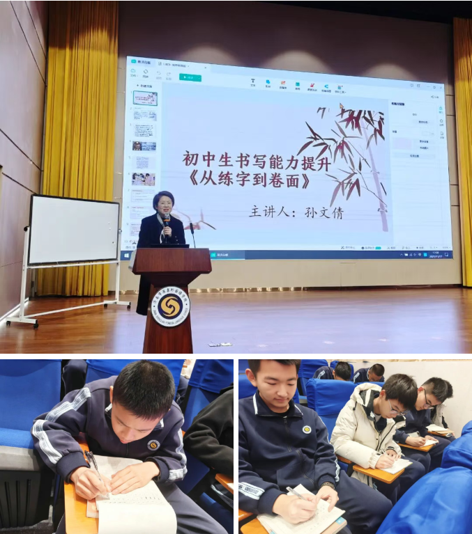 为进一步提升活动成效,学部还特别组织了面向全体师生的书法学法指导大会。会议特邀学校书法提升导师孙文倩担任主讲。孙老师深入浅出地剖析了基本笔画的书写要领与间架结构的布局规律,并现场示范,将理论与实践紧密结合,为师生带来了一堂生动而实用的书法启蒙课,现场学习氛围浓厚。