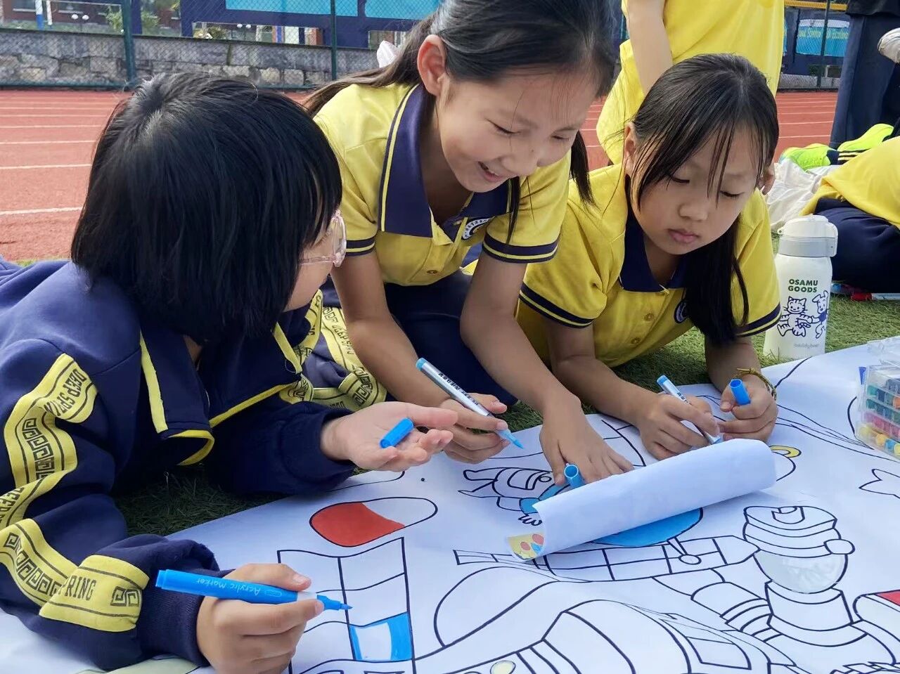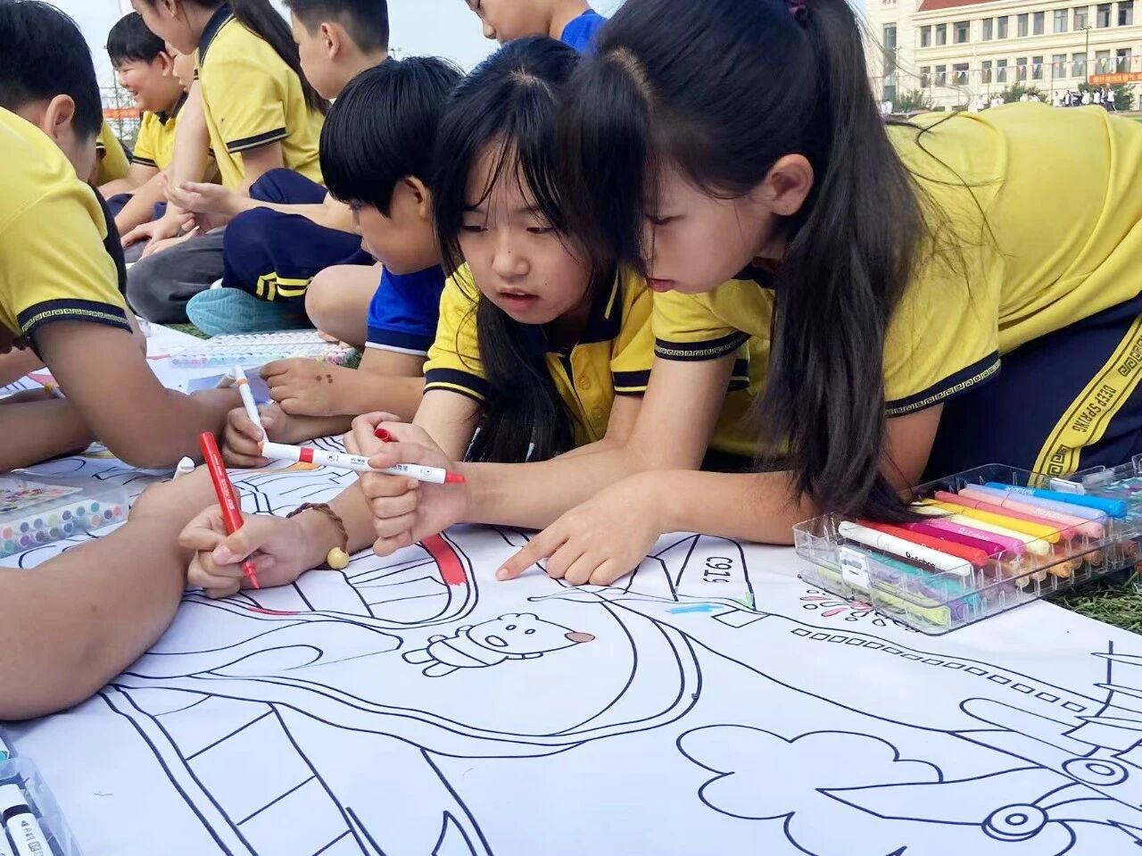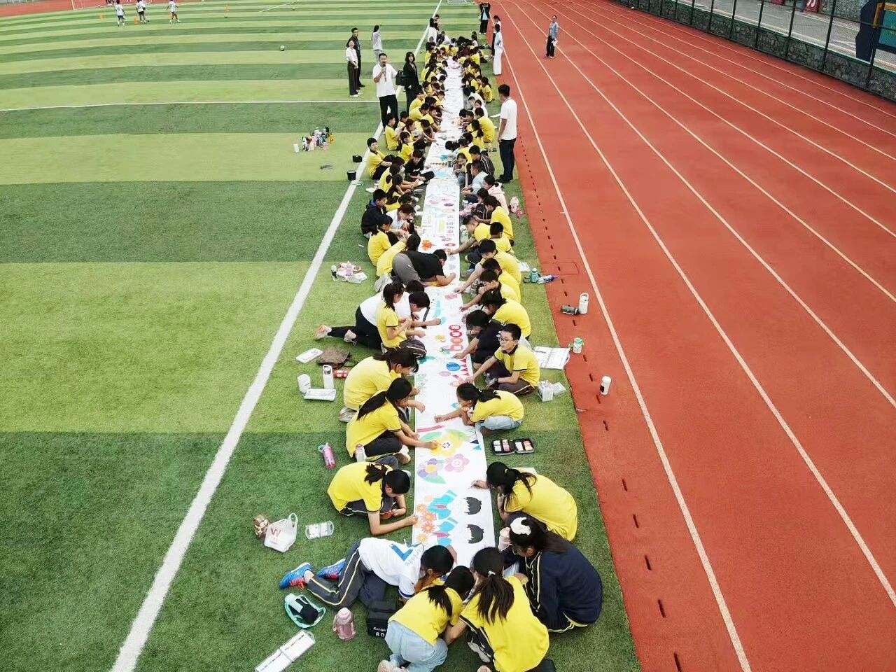 本次活动的高潮当属“百人同心绘中华”长卷创作环节。一幅长达50米的画卷在风雨操场徐徐展开,孩子们俯身于白色长卷两侧,手持彩笔,神情专注。