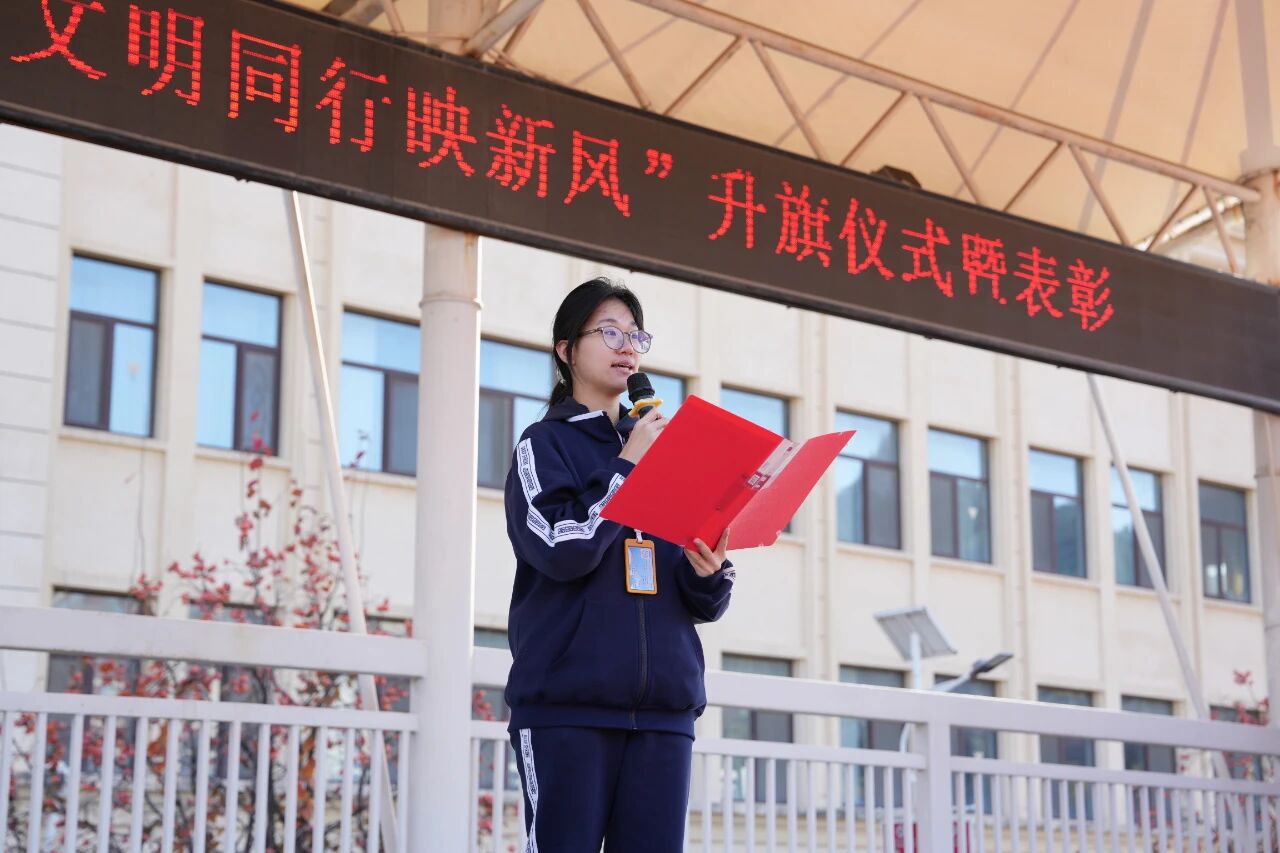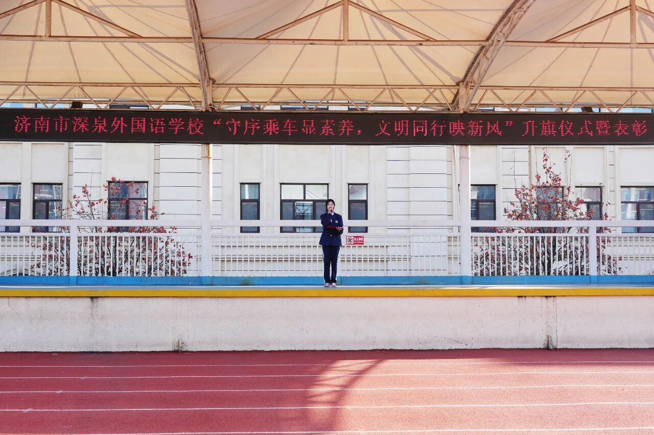 11月10日,冬日暖阳洒满校园,济南市深泉外国语学校高一、高二级部及国际教育中心师生齐聚操场,举行“守序乘车显素养,文明同行映新风”升旗仪式暨楷模奖表彰大会。本次大会由高一级部曹丹如同学主持。