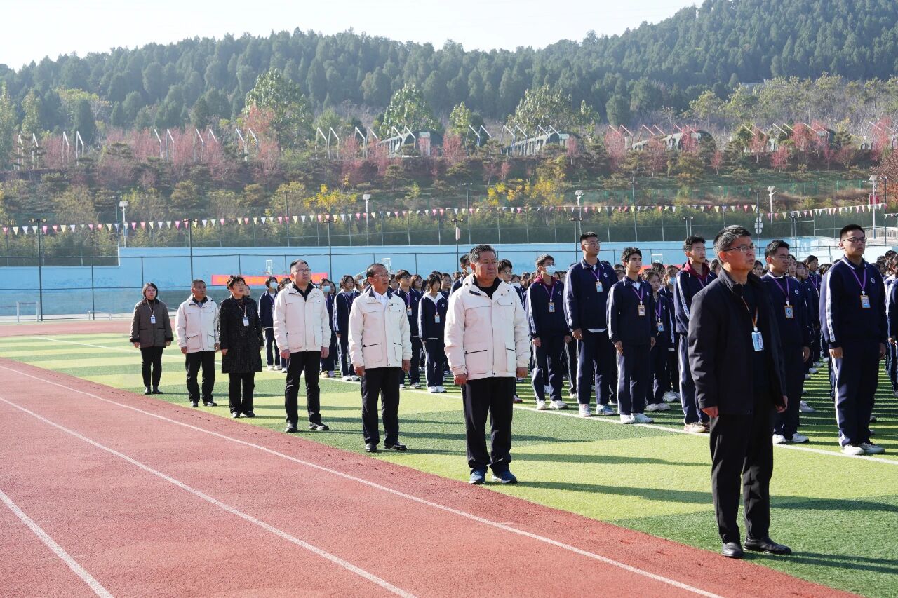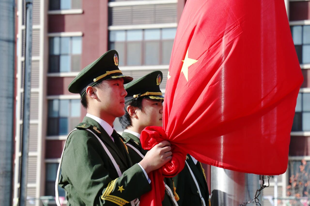在激昂雄壮的《义勇军进行曲》中,五星红旗冉冉升起,全体师生肃立注目,以崇高敬意致敬国旗。