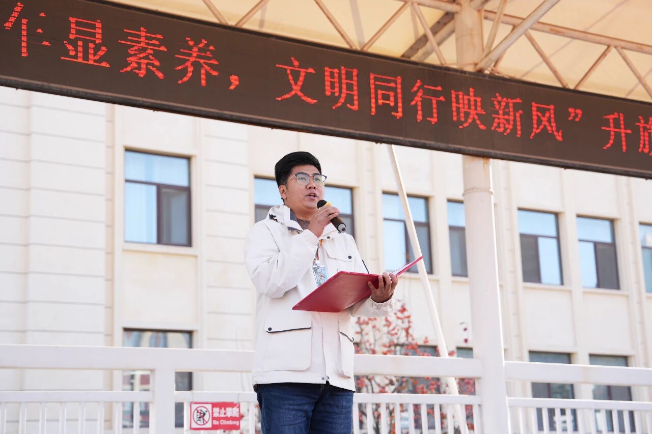 随后,高一级部副主任丛干军上台发言。他表示,乘坐班车往返学校虽是校园生活的平常小事,却如一面镜子映照出每个人的文明素养,这些行为既关乎文明更关乎安全。他向全体同学发出“乘车文明公约”:做“守时重信”的践行者,提前候车尊重他人时间;做“宁静致远”的维护者,轻声交流体谅他人需求;做“行为规范、举止优雅”的示范者,严守校规、敬畏生命,展现深泉学子阳光健康的良好形象。