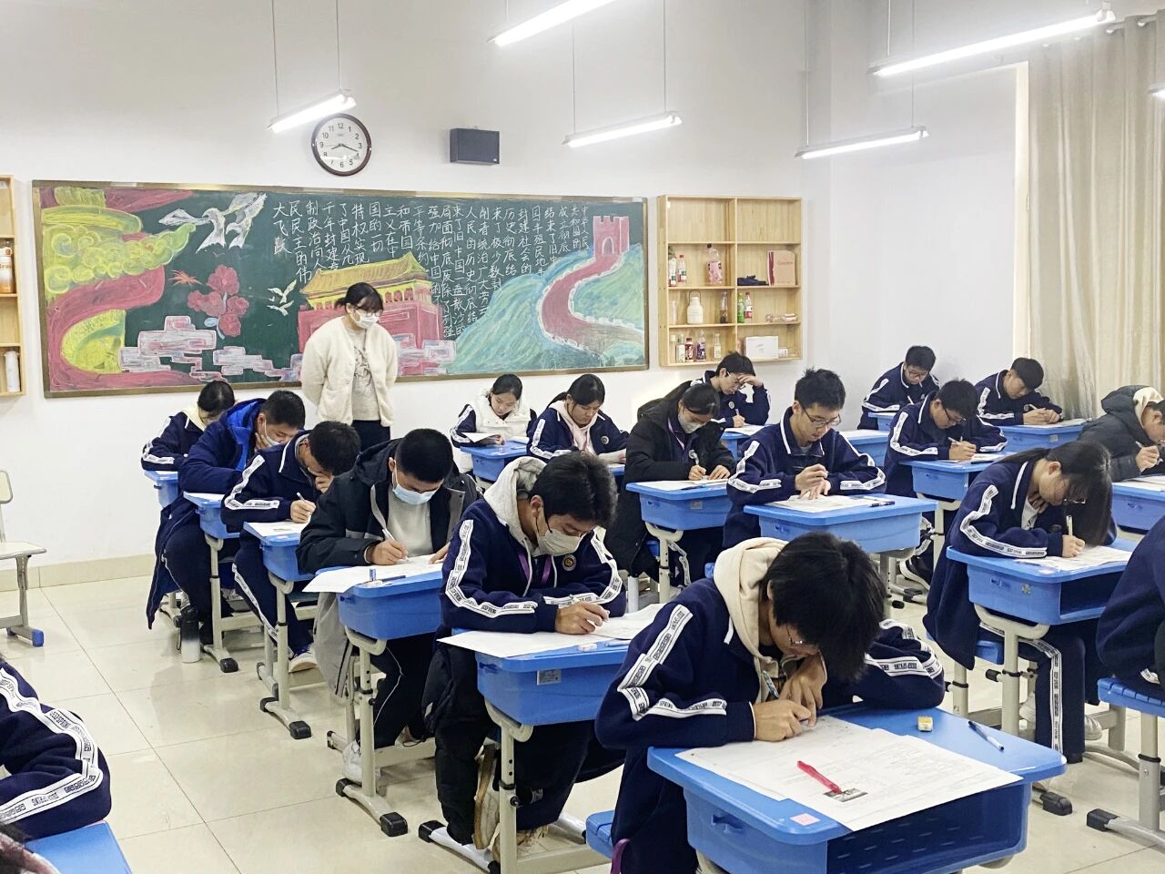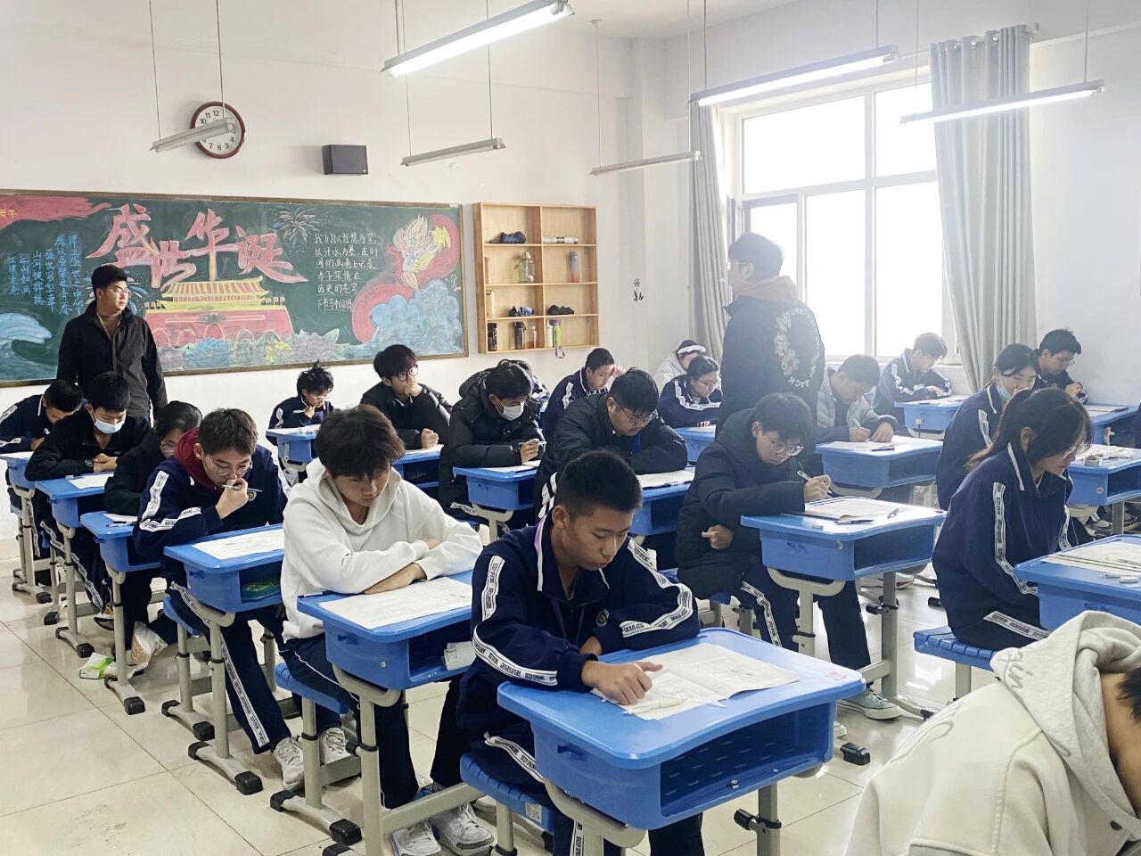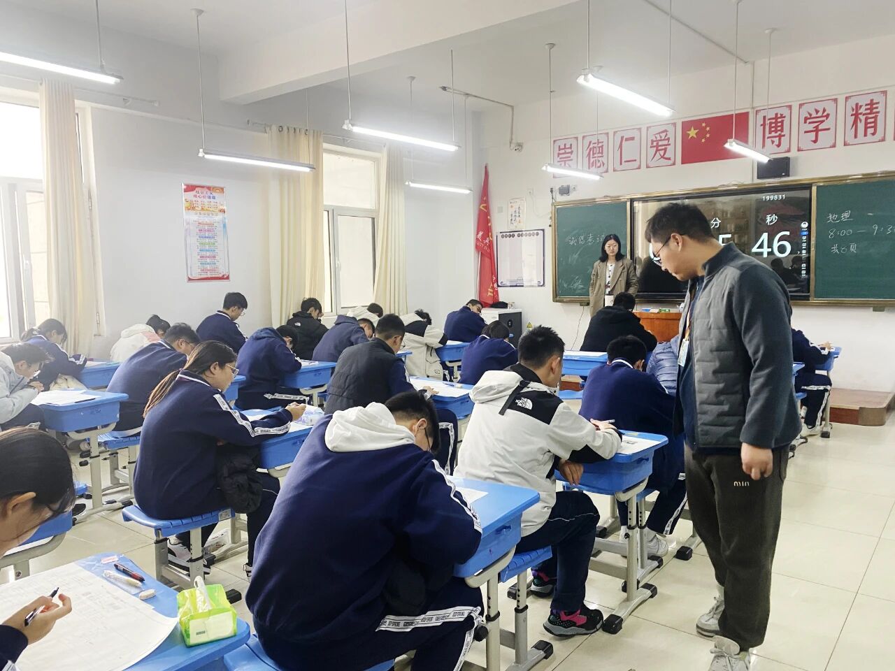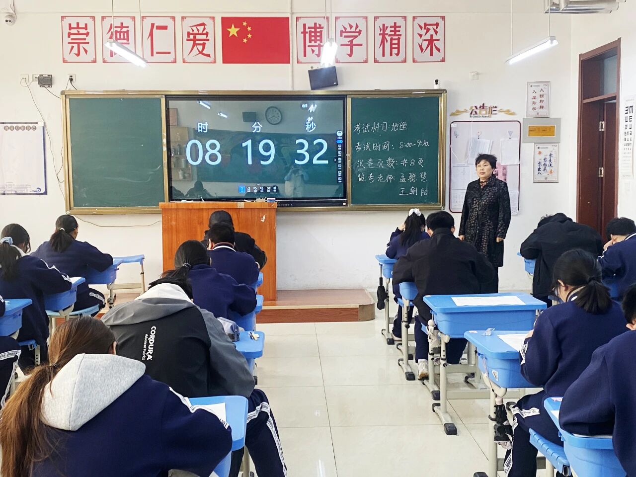 当开考铃声响起,原本喧闹的教学楼顿时变得安静,唯有笔尖划过试卷的“沙沙”声,认真且专注。此时,级部领导密切关注着考生动态,程霞副校长与王豪主任走进各个考场开展巡考,目光扫过专注答题的学子与认真监考的老师。领导的巡考身影,为这场考试增添了一份安心与规范。