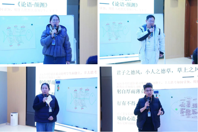 第一小组从人际关系、家校沟通、课堂纪律、宿舍卫生和休息秩序、请假常规等方面进行了归因和解决策略的分享。第二小组聚焦学生群体性、个人性及违规违纪问题,特别指出群体违纪行为对班风的影响。第三组重点关注班委建设、工作前置及家校协同,补充强调了师生关系是人际关系的重要一环,倡导建立平等尊重的师生关系。第四小组及国际教育中心班主任代表分享了如何促进学生将规则内化于心、外化于行,引导学生认识自我价值,树立正确“三观”。
