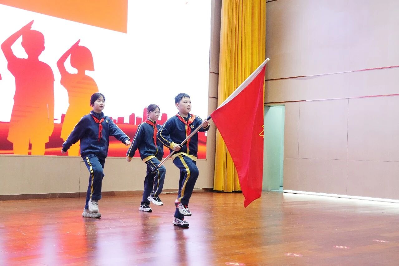 大会在庄严的出旗仪式中拉开帷幕。全体人员肃立致敬,少先队员行队礼,鲜艳的红领巾与队旗交相辉映。随后,全场高唱《中国少年先锋队队歌》,歌唱着少先队员们对党和祖国的热爱与忠诚。