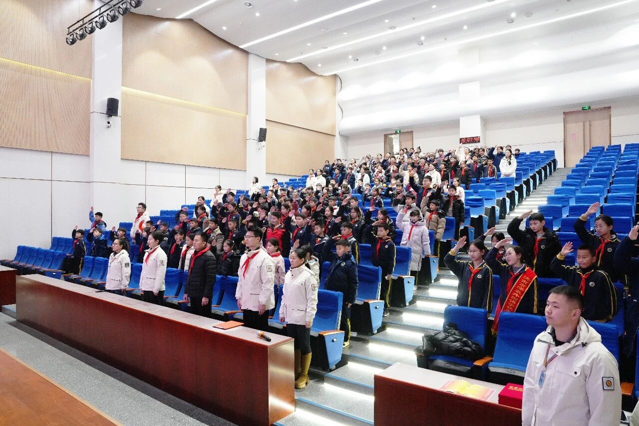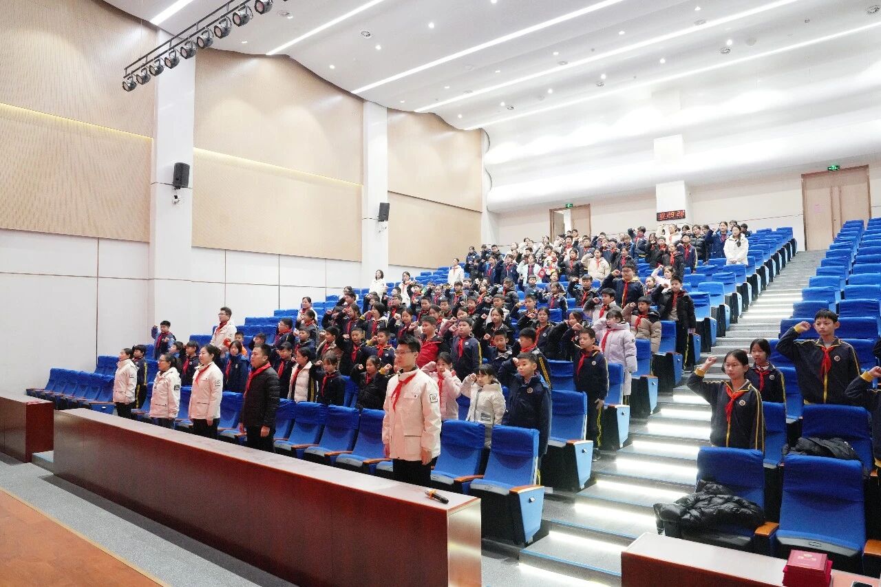 大会最后,全体少先队员代表在大队辅导员徐老师的带领下庄严呼号:“准备着,为共产主义事业而奋斗!”“时刻准备着!”嘹亮的呼号声响彻报告厅,汇聚成少先队员们践行使命、勇担重任的坚定誓言。伴随着退旗曲的奏响,大会在庄重的退旗仪式中圆满落下帷幕。