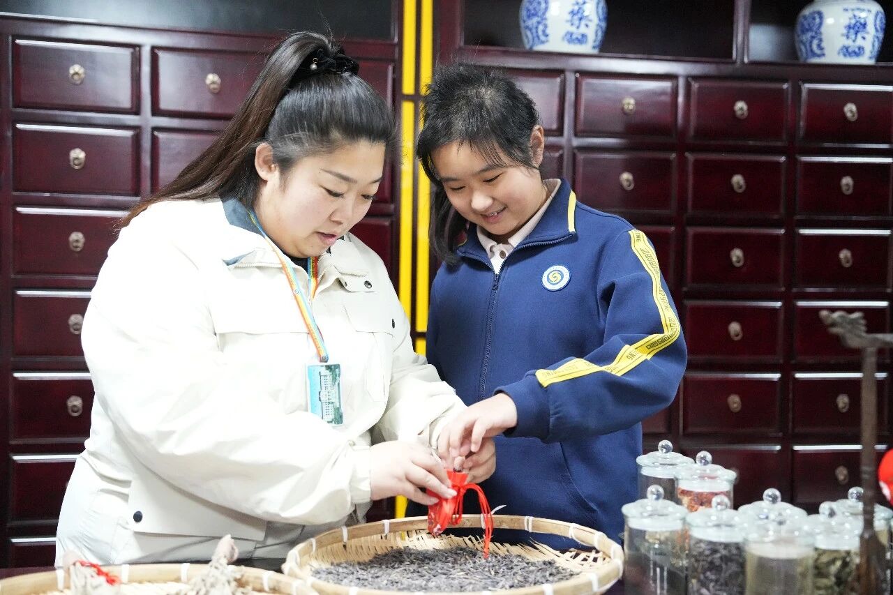 ▲ 中医药文化课,李玥晓与周老师一起制作香囊