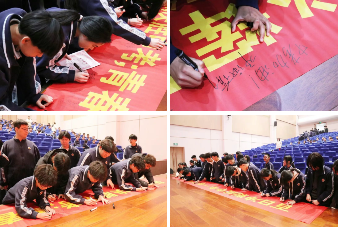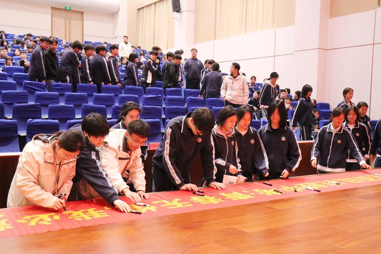 大会最后,师生们在横幅上签名留言。横幅上密密麻麻的名字,是承诺,是期许,更是彼此之间无声的约定——一百天后,顶峰相见。