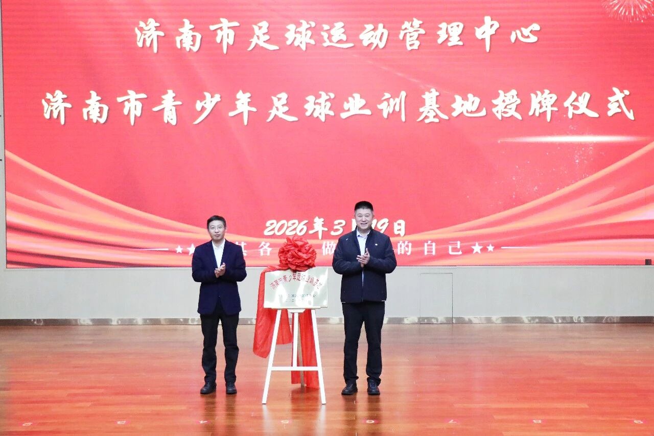 济南市体育局党组成员、副局长王建军与深泉外国语学校书记贝广勇为“济南市青少年足球业训基地”揭牌,标志着济南青少年足球青训体系在基层落地生根,为平阴青少年足球苗子搭建起更高规格的成长平台。