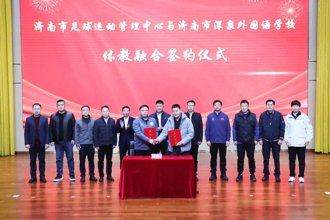 济南市足球运动管理中心党支部书记、副主任张斌斌与深泉外国语学校副校长唐文滨代表双方签署体教融合合作协议,凝聚起深化合作、共育人才的坚定决心。
