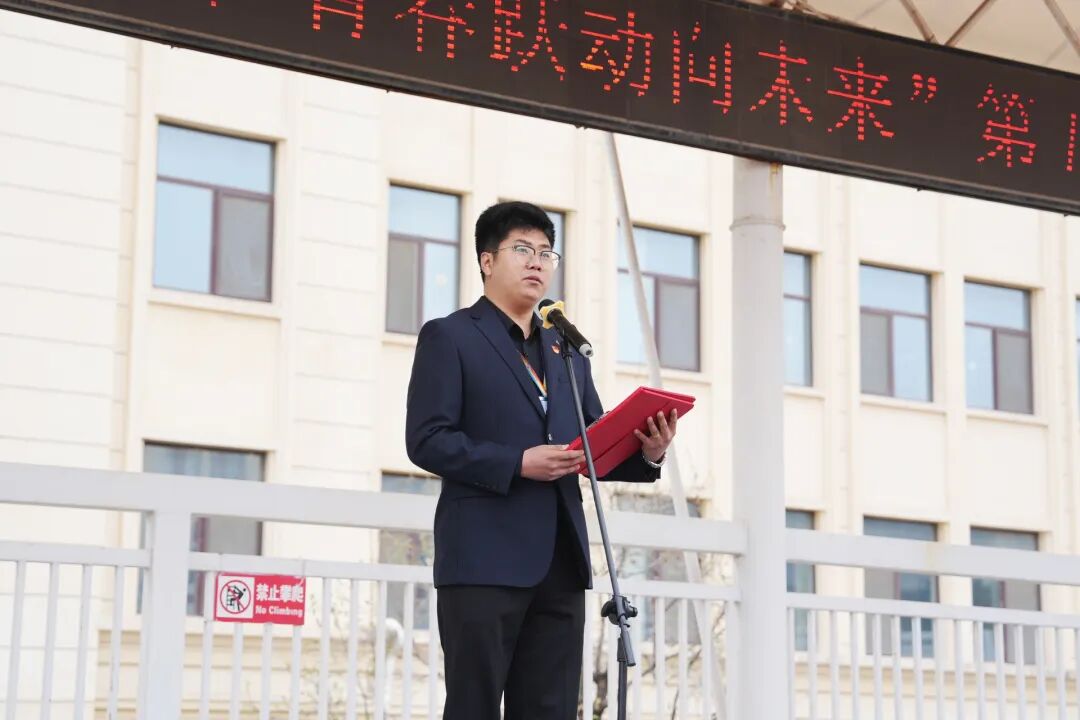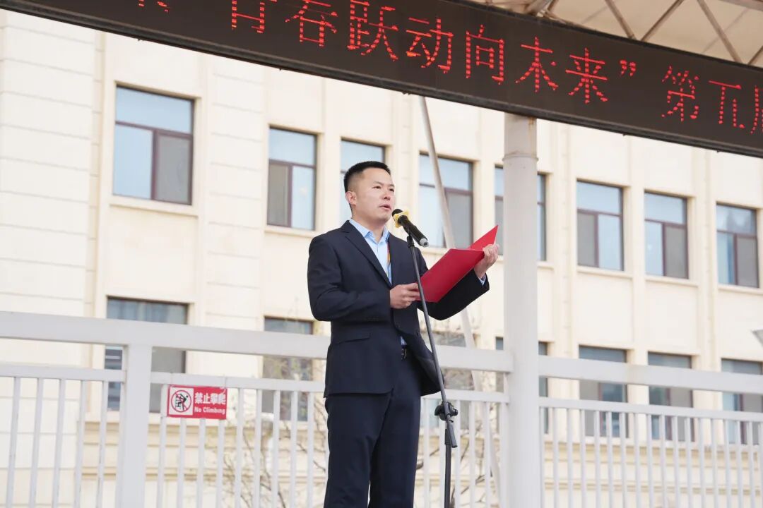 高一级部副主任丛干军上台讲话。他鼓励全体同学积极参与赛事,在运动中强健体魄、磨砺意志,将赛场上的拼搏精神转化为学习的不竭动力;号召全体教师率先垂范,主动参与,以实际行动引领学生成长。活动期间,望全体师生坚守安全底线、展现文明风貌,全力确保本届体育节安全、有序、精彩举办。